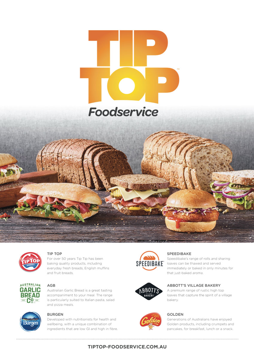 Tip Top Foodservice is a specialist bakery division providing fresh and frozen bakery products to cafes, restaurants, schools, hotels, caterers, aged care and pubs.